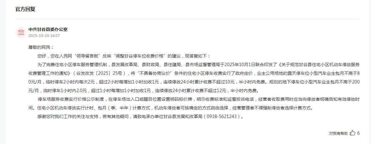 收到留言后,甘谷县委办公室对相关问题作出回复:“甘谷县发展改革局、县财政局、县住建局、县市场监督管理局于2025年10月1日联合印发了《关于规范甘谷县住宅小区机动车停放服务收费管理工作的通知》,将‘不具备协商议价’条件的住宅小区停车收费实行了政府定价,公用场地的露天停车位小型汽车业主包月不高于80元/月,临时停车2小时内每次2元,超过2小时每增加1小时加收1元,连续停放24小时累计收费不超过10元,半小时内免费。规划的地下停车位小型汽车业主包月不高于200元/月,临时停车1小时内2.0元,超过1小时每增加1小时加收1元,连续停放24小时累计收费不超过12元,半小时内免费。”